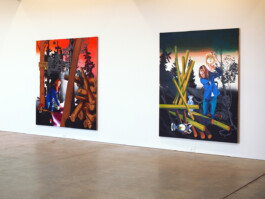 These large-scale works are dense with visual content, and tend to combine indoor and outdoor scenery into one comprehensible "backdrop" for her figures and objects. The composition and imagery reference Northern Renaissance etchings and Japanese woodcuts. These crowded depictions of chaotically organized planks of wood, animals, flora, furniture and fine china are offset by large flat planes of color, devoid of legible narrative and more reflective in subject matter. These elements reference European art history while creating a sense of thoughtful, distorted perspective and abstraction.